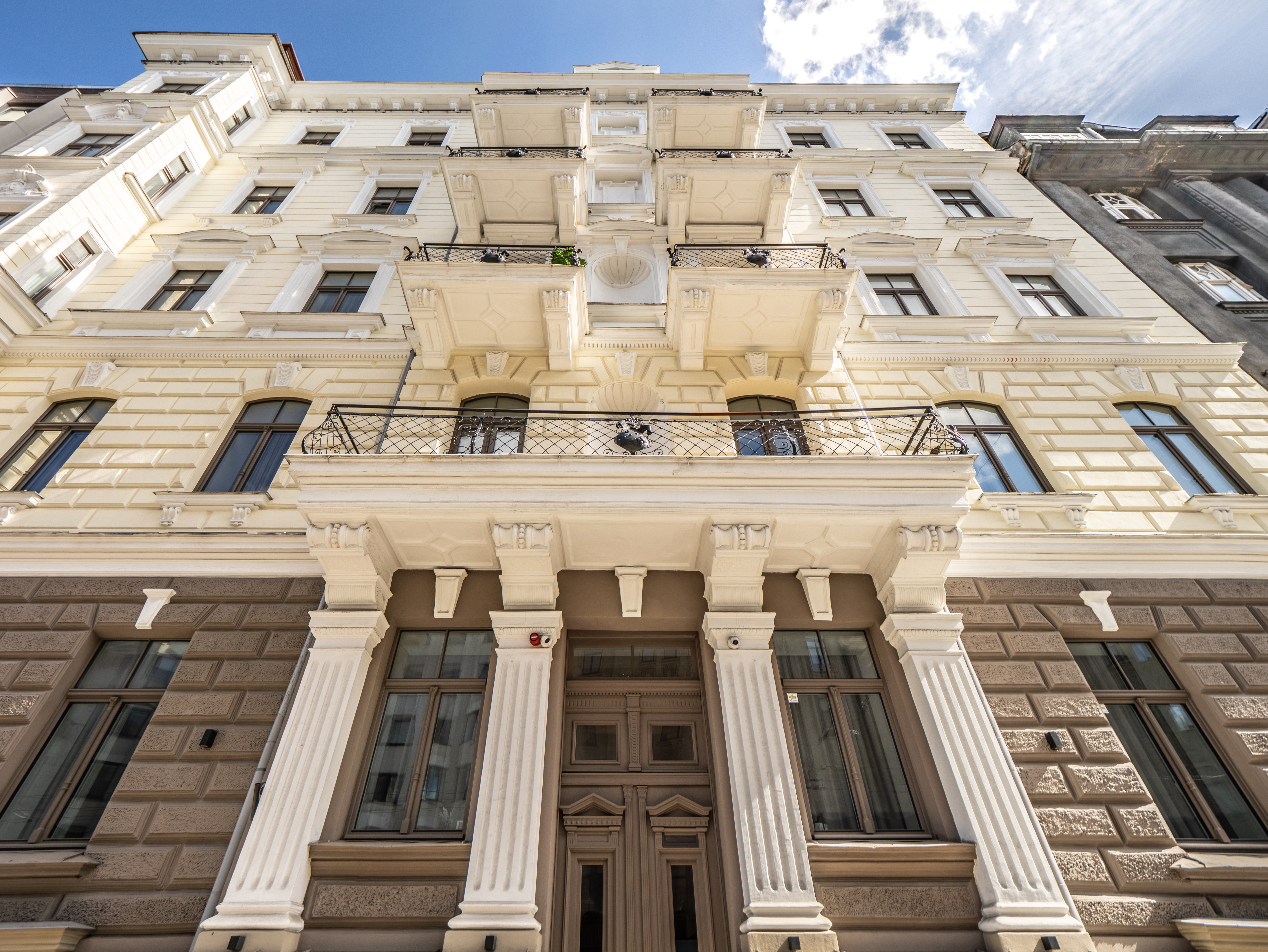 • Building description: entrance from the facade side, facade building, renovated building, with elevator