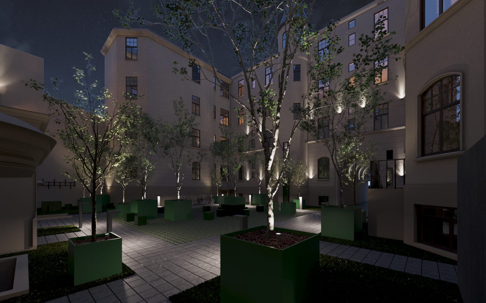 + Landscaped and greened courtyard with benches and bicycle parking.