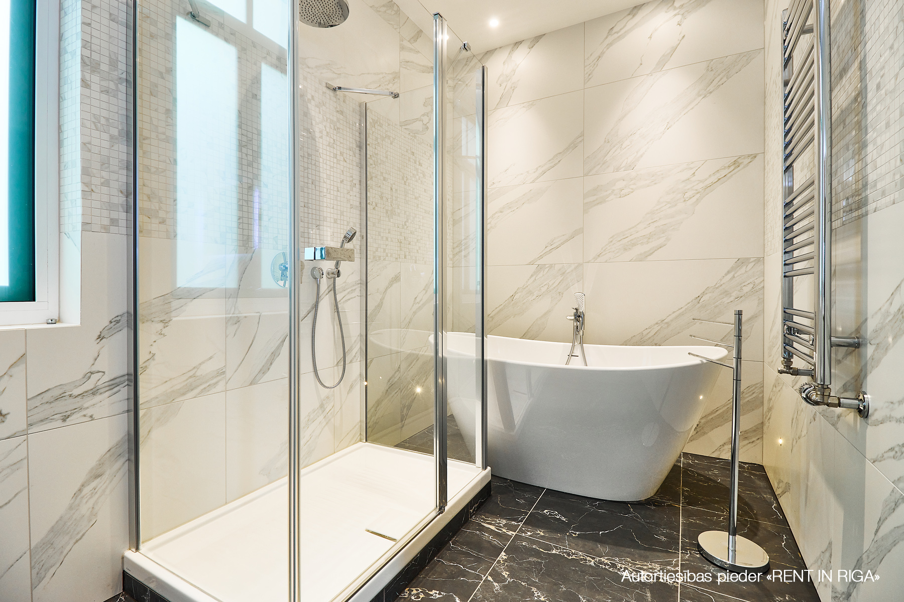 Dzīvoklis atrodās divos stāvos (4.un 5.), sistēma “Gudrā māja”, kamīns. Kvalitātes garants ir pasaulē slavenu zīmolu izmantošana. Rozetes un slēdži – Vācijas zīmols Jung. Keramikas santehnika no Falper, Zucchetti, Teuco, Bisazza, radiatori no Tubes. Skapji, mēbeles – Lema, Molteni&C, Moooi, Ligne Rosset u.c. Virtuves iekārtas – Arclinea.