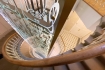Grezna kāpņu telpa ar stikla kupolu un lifts ar panorāmas skatu. Ēkā ir konsjeržs.