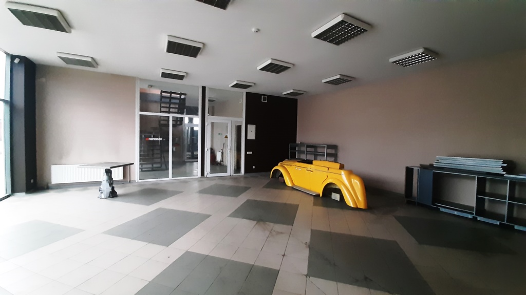 Pirmais stāvs ( kopplatība 318.8 m): 2 servisa/ noliktavas telpas (94 m2 un 92.5 m2,), veikala telpa (72.7 m2), vestibils, garderobe, dušas telpa, 2 WC, virtuve, gaitenis, katlu telpa. Servisa telpām augstums 5.45 m, pārējām telpām – 3.40m.