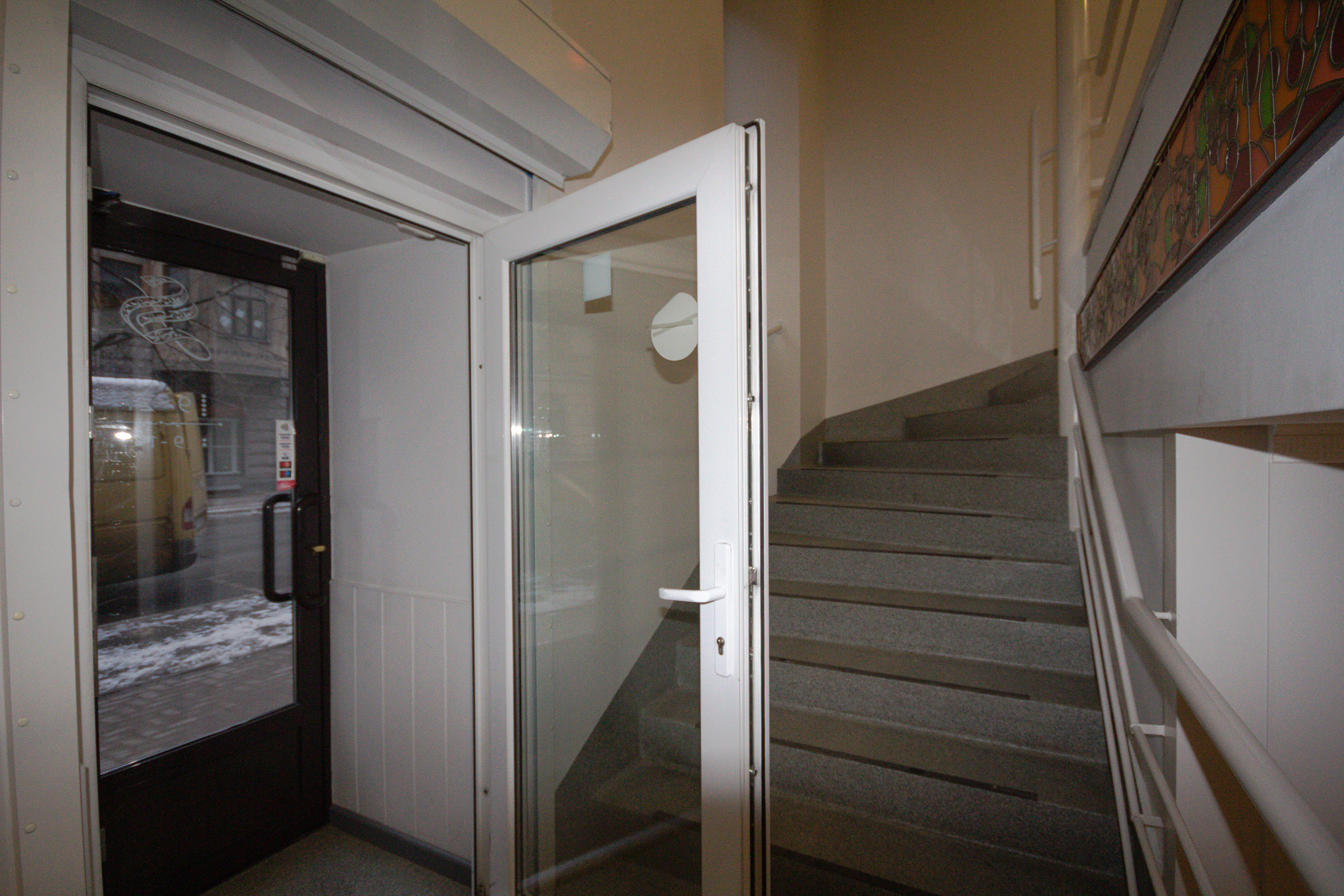 Ieeja ir no ielas puses. Ir vēl 2 papildus ieejas, no kāpņutelpas abos stāvos. Kopā 3 ieejas.